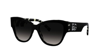 Gafas de sol con un diseño moderno y llamativo. - Montura negra con detalles en blanco y negro. - Lentes degradadas. - Logo de la marca en las patillas.
