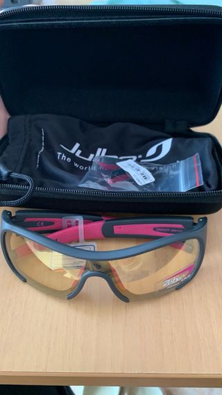De estilo esquiador, alta calidad y diseño futurista. Las patillas están ligeramente teñidas, según se aprecia en las fotos. Las vendo porque ahora las necesito graduadas. Se incluye gamuza, su funda e instrucciones que acreditan la marca.