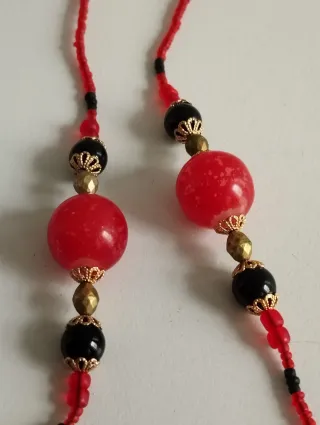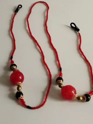 No vuelvas a perder tus gafas! Precioso cordón artesanal, perfecto para llevar tus gafas de sol o de ver, con estilo y seguridad. Presenta un diseño llamativo que combina pequeñas cuentas rojas con detalles en negro y piezas centrales más grandes para un toque elegante y original. Es el accesorio perfecto para no perder tus gafas y llevarlas cómodamente colgadas con un diseño original y elegante. Cuentas centrales de mayor tamaño, de resina, resistentes y ligeras, con remates metálicos labrados. Terminales de goma negra universales, se adaptan a cualquier patilla (gafas de sol o graduadas). Estilo étnico.