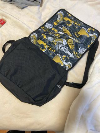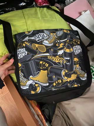 Mochila con un diseño llamativo y urbano.Tiene 2 cremalleras ,atras otro bolsillo amplio pero sin cremallera - Estampado de spray, zapatillas y gafas de sol. - Combinación de colores negro y amarillo.