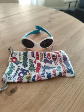 Gafas de sol para bebé con un diseño divertido y moderno. Incluyen una funda protectora. - Montura blanca y azul. - Funda con estampado de cómic.