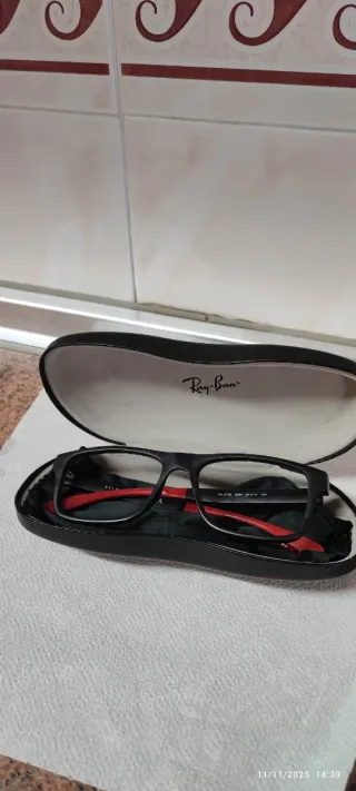 Montura de gafas de la marca Ralph Lauren. Originales - Color negro mate y rojo. - Medida de la montura 14cm. y de las patillas 14'5 cm. - Incluye estuche Ray-Ban original. No envío.