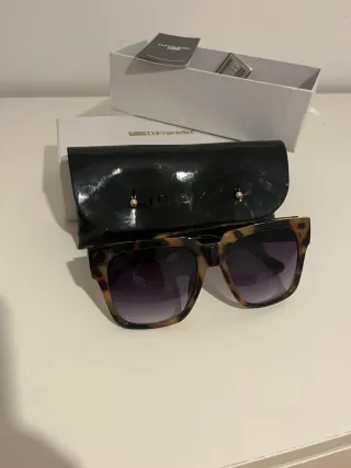 Gafas de sol Kimoa con un diseño moderno y elegante. - Montura de acetato con estampado de carey. - Lentes con protección UV. - Incluye funda protectora y estuche de cartón con goma elástica.