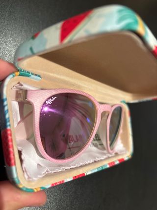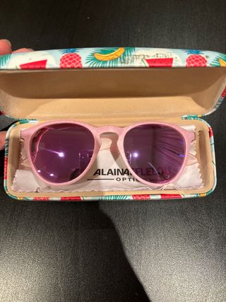 Gafas de sol Alain Afflelou con lentes polarizadas. - Montura de color rosa. - Lentes con tonalidad púrpura. Uso MINIMO. Estan prácticamente nuevas, se vende CON pañuelo y caja (fotos).