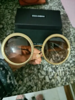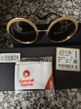 Elegantes gafas de sol con un diseño llamativo. - Montura redonda con detalles dorados. - Lentes con tonalidad marrón. - Estilo moderno y sofisticado. - Están descatalogadas; las compré en GENERAL ÓPTICA - No las estrené nunca. - No tienen ningún rasguño ni absolutamente nada. - Están con su cartuchera y su caja; lo único que no tengo es librito que venía dentro
