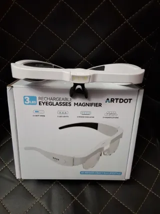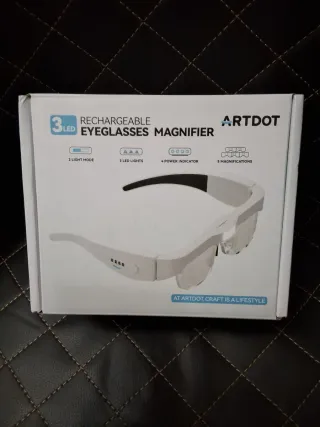 Gafas lupa ARTDOT con luz LED, perfectas para manualidades, modelismo, electrónica o costura. Incluye: - 5 lentes intercambiables (0.75X a 4.0X). - Cuenta con 3 luces LED para ver cada detalle con claridad, con 2 niveles regulables. - Trapito para limpiar las gafas. - Cable USB tipo C para cargarlas. - Cinta para ajustarla a la cabeza. - Destornillador para ajustar las patillas. Son ligeras, cómodas y fáciles de usar, ideales para trabajos de precisión.