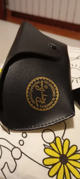 Estuche para gafas Ray-Ban en color negro con detalles dorados. Incluye un par de gafas con montura dorada y patillas con diseño. - Estuche de cuero sintético. - Cierre a presión.