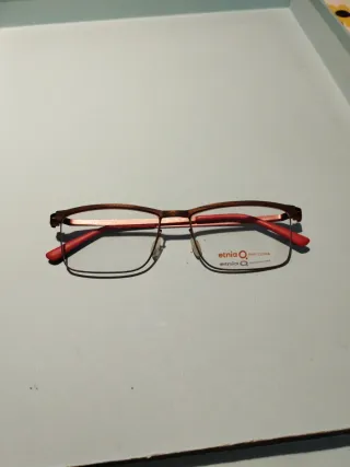 Gafas de la marca Etnia Barcelona, aptas para graduar o como gafas de sol. - Montura metálica en tono marrón. - Detalles en color rojo en las patillas y la parte inferior de la lente.