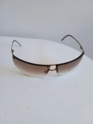 Gafas de sol de la marca Gucci con un diseño vintage. - Montura en tonos marrones y dorados - Lentes con degradado. - La patilla está rozada, se ve en la foto. - Funda original aunque algo rozada.