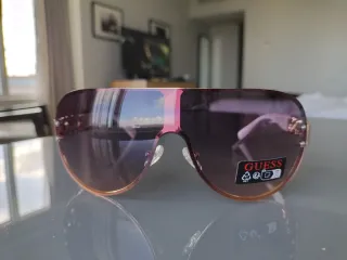 Gafas de sol Guess con montura dorada y lentes rosadas. Incluyen su funda original. - Montura metálica dorada. - Lentes con efecto rosado y degradado a azul. - Funda protectora de piel roja.
