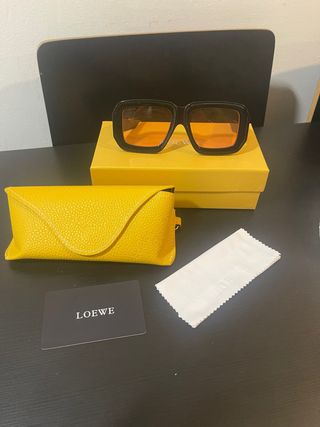 Gafas de sol Loewe de estilo vintage. Grandes cuadradas con cristal ahumado. Son auténticas. Logos laterales con troquelado del logo en las patillas y número de serie y modelo en el interior de la patilla. Perfecto estado. Favorecen mucho y protegen realmente del sol. Te regalo funda rígida de rayas marineras. - Montura con degradado de color naranja a marrón. - Lentes oscuras.