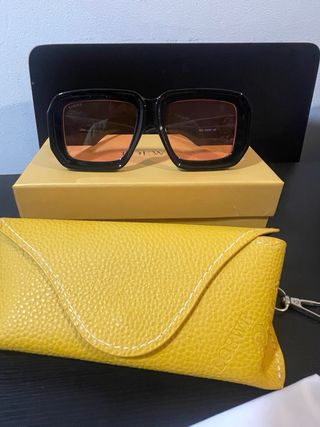 Elegantes gafas de sol con montura llamativa. - Detalle dorado en las patillas. - Diseño moderno y sofisticado. - Muestro ticket de compra