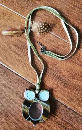 Collar con colgante de lupa con diseño de búho, práctico para un momento dado sin necesidad de buscar tus gafas. - Ambas lentes con lupa. - Correa de terciopelo verde - Plumas de adorno. - Cierre seguro
