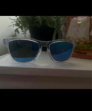 Gafas de sol Oakley con lentes de espejo azules y moradas. - Montura transparente. - Incluye estuche y funda protectora.