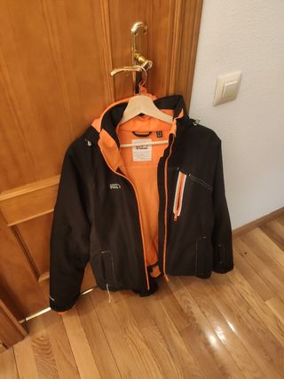 Chaqueta de esquí para hombre con un diseño moderno y funcional. - Color principal negro con detalles en naranja. - Cremallera frontal y bolsillo totalmente funcional - Bolsillos laterales así como en la ma ha izquierda. - Bolsillo interior y funda para guardar las gafas - Con capucha - Apenas usada