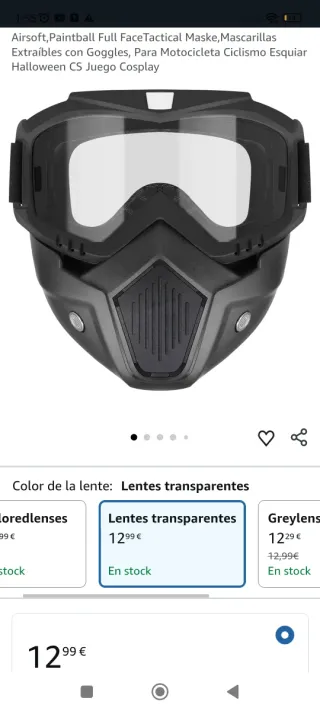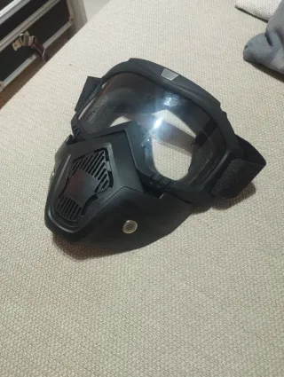 Descripción de Amazon: Máscara táctica negra para airsoft, cosplay o eventos de Halloween. Diseño extraíble con gafas. - Lentes transparentes incluidas. - Ideal para motociclismo, ciclismo y esquí.