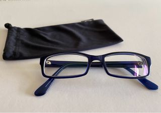 Montura de gafas de ver para mujer. De pasta color azul. Incluye funda de tela.