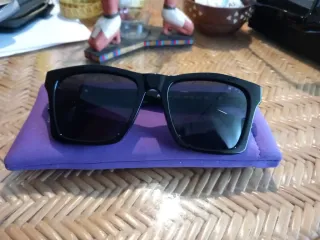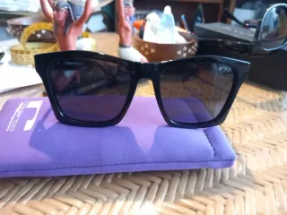 Gafas de sol con montura negra y lentes oscuras. - Incluyen funda protectora de color morado.