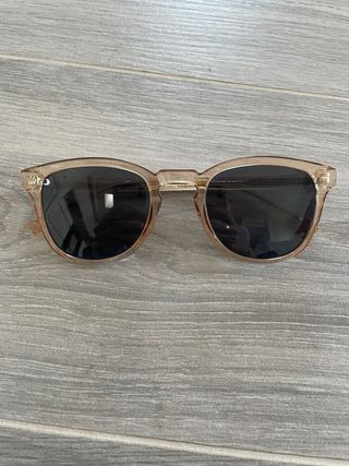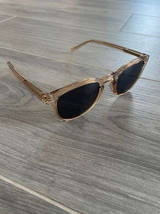 Gafas de sol de mujer estilo Wayfarer con montura de plástico beige transparente. Con lentes negras tintadas. Un diseño moderno y fácil de combinar, perfecto para el día a día o para verano.☀️ En muy buen estado.