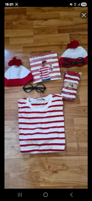 Completo disfraz inspirado en Wally, perfecto para fiestas o eventos. - Gorro a rayas rojas y blancas con pompón. - Gafas redondas negras. - Camiseta a rayas rojas y blancas. - Calcetines a rayas rojas y blancas.