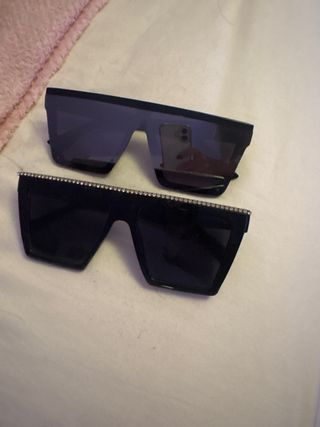 Conjunto de dos gafas de sol con un diseño moderno y llamativo. - Montura negra. - Lentes oscuras. - Detalle de pedrería en la parte superior de una de las monturas.