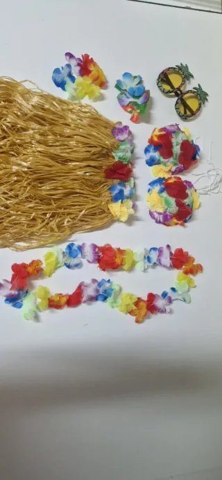Conjunto de disfraz hawaiano para fiestas o eventos temáticos. - Falda de hierba. - Collar de flores. - Adornos para el pelo. - Gafas de piña.