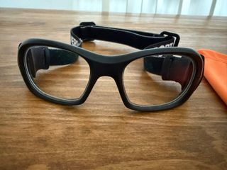Montura de gafas VERSPORT con funda naranja. - Montura negra. - Correa ajustable. - Funda de tela naranja.