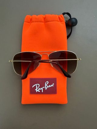 Gafas de sol Ray-Ban estilo aviador, con montura dorada y lentes verdes. Se han usado un par de veces y se entregan con su funda original. - Montura metálica dorada. - Lentes de cristal color verde. - Incluye funda protectora.