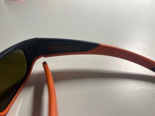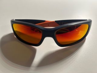 Gafas de sol para niños con un diseño deportivo y moderno. - Montura en color negro. - Detalle en color naranja en las patillas. - Lentes con acabado espejo en tonos rojos y naranjas.