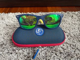 Gafas de sol con montura azul y lentes verdes. - Montura de color azul. - Lentes con acabado verde reflectante. - Incluye funda protectora original. - Son talla de niño -PRECIO NEGOCIABLE