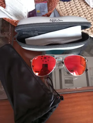 Gafas de sol infantiles de la marca Afflelou. - Montura plateada. - Lentes de color rojo. - Incluye 2 fundas protectoras,una de ellas dura y paño de limpieza.Usadas dos veces,sin rayones y abren y cierran bien.Mo de envía,están en Berlanga de Duero,se pueden entregar en mano en Soria,Valladolid o Zamora