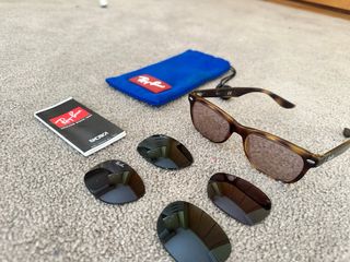 Gafas de sol Ray-Ban con montura marrón y un diseño moderno. Incluyen lentes intercambiables para adaptarse a diferentes condiciones de luz. - Montura de acetato. - Lentes con protección UV. - Incluye dos pares de lentes adicionales.