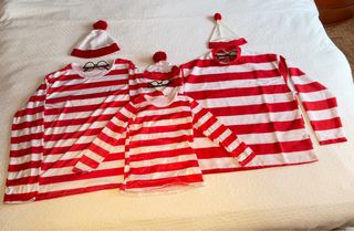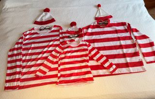 Conjunto de disfraces del personaje Wally. - Incluye gorro y gafas. - disfraz de mujer: hecho a mano. Talla L amplia. Precio: 15€ - disfraz hombre: talla XL, pero talla pequeño, más bien es una L. Precio: 15€ - disfraz niño/a: talla 8-10, pero talla pequeño, más bien 5-6 años. Precio: 10€ si se compran los 3: 30€