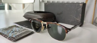 Vendo gafas de sol Persol 9031-S originales, hechas a mano en Italia. Montura havana y lentes verdes Persol. Estado muy bueno, sin grietas ni roturas. Uso normal. Modelo clásico, elegante y muy cómodo (sistema Meflecto). Incluyen estuche original Persol. Medidas: 53-17 / 140