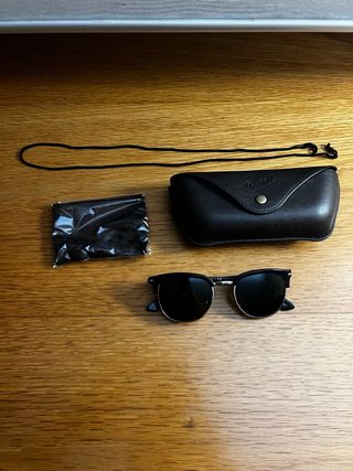 Gafas de sol Persol con montura negra y detalles plateados. Incluyen funda y accesorio. Usadas 2-3 veces. - Montura de metal y acetato. - Lentes oscuras. - Funda protectora. - Cordón para colgar. - Toallita para limpiar.