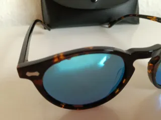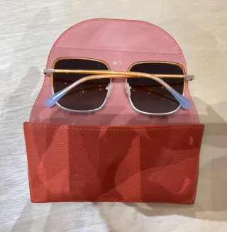 Gafas que se han probado dos veces y están sin uso con su funda rígida original. Cristal azulado-degradado polarizado. Detalles de la marca en patillas.