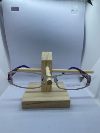 Elegante montura de gafas de la marca Agatha Ruiz de la Prada. - Diseño moderno con detalles en morado y plata. - Montura metálica. - Patillas con diseño decorativo.