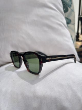 Gafas de sol Prada, con montura elegante en tonos marrones y verdes. Son gafas de estilo moderno y sofisticado. - Montura de pasta. - Diseño rectangular. - Color marrón con detalles verdes. Las vendo muy rebajadas porque se soltó el tornillo y en la optica me lo pegaron (pegamento especial irrompible)
