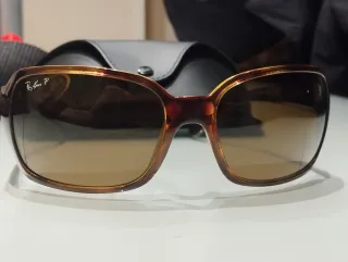 Gafas de sol Ray-Ban con montura negra y lentes marrones. En buen estado. Funda con una pequeña raja. Gafas algo rayadas. Pero se ven bien. - Montura de color negro. - Lentes con tonalidad marrón.