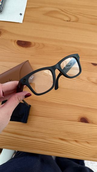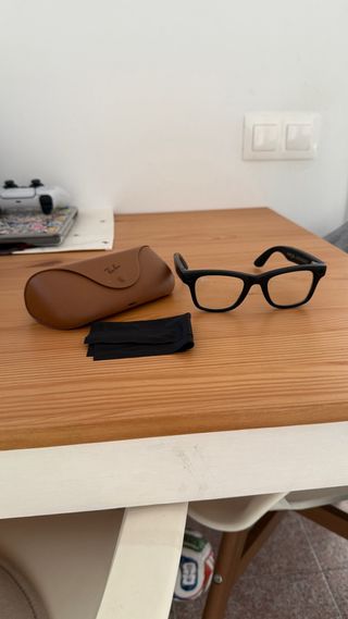 Lentes inteligentes Ray-Ban Meta de primera generación. Incluyen su funda original y paño de limpieza. - Se obscurecen con el sol, son fotocromáticos. - Montura negra. - Funda de cuero marrón.
