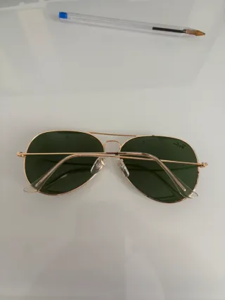 Gafas de sol estilo aviador con montura dorada y lentes oscuras. - Diseño clásico. - Lentes con tinte oscuro. Están en buen estado general, perfectas para el día a día o looks aviador timeless. Detalles honestos: Solo dos rallitas muy leves en la lente izquierda (apenas se notan al usarlas, no afectan la visión ni el estilo). La numeración en la patilla está algo desgastada por el uso normal (típico en Aviator de varios años), pero el logo en la lente y todo lo demás se ve nítido. Montura sin golpes ni deformaciones, bisagras firmes y ajustadas. Lentes sin rayones profundos, con buena protección UV.