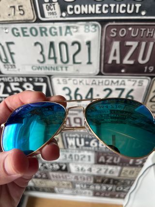 Gafas de sol estilo aviador con lentes de color azul y montura dorada. Modelo icónico de la marca. Un must have. Usadas en buen estado. Calibre 55. Tamaño pequeño. R9 - Lentes azuladas - Montura metálica. - Diseño clásico aviador.