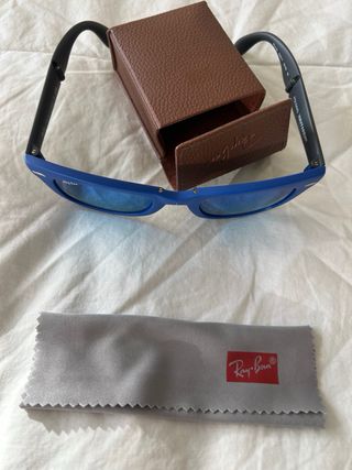 Gafas de sol Ray-Ban Wayfarer plegables con lentes de espejo azul y patillas grises . preciosas! - Montura azul. - Lentes con efecto espejo. - Diseño plegable para fácil transporte. - Incluye funda y paño de limpieza. un capricho a muy buen precio: 100% originales y en estado casi nuevo...las he usado poquísimo . están a un precio magnífico ... por favor no ofertas ridículas ....