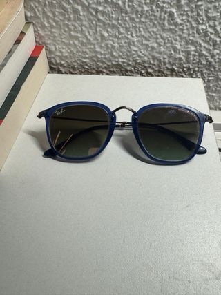 Gafas de sol Ray-Ban con montura azul y lentes degradadas. - Montura de color azul. - Lentes con degradado gris. - Incluye funda protectora. NO TIENEN ARAÑADOS NI MARCAS. LA FUNDA CIERRA PERO ESTA ROTO EL ENGANCHE