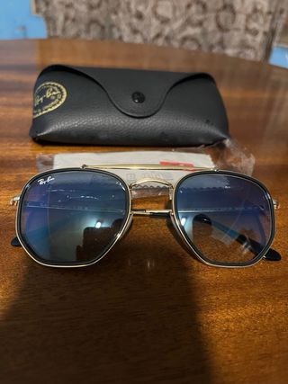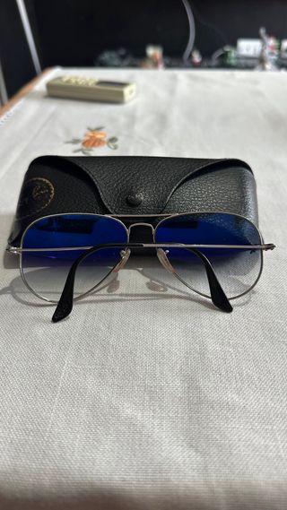 Gafas de sol Ray-Ban originales estilo aviador con montura dorada y lentes azules. Compradas en óptica. Incluyen su funda original. - Montura metálica. - Lentes con degradado azul.
