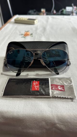 Gafas de sol Ray-Ban con un diseño moderno y elegante, aviador. Prácticamente nuevo. - Montura plateada. - Lentes con efecto espejo azul degradado. - Incluye funda protectora y paño de limpieza.