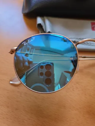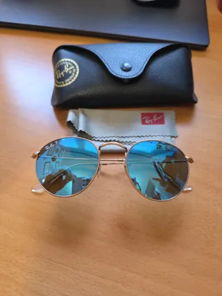 Gafas de sol Ray-Ban RB3447 Round Metal con lentes azules y montura dorada. - Modelo: RB3447 Round Metal. - Lentes: Acabado espejo azul. - Montura: Metálica dorada. - Accesorios: Incluye funda y paño de limpieza. - Observaciones: Presenta una pequeña imperfección interna que no compromete la visión.