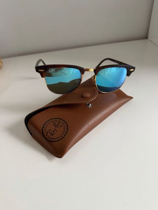 Gafas de sol Ray-Ban modelo Clubmaster con lentes de espejo azul. - Montura marrón tortuga. - Lentes con acabado espejo azul. - Incluye funda de cuero marrón.