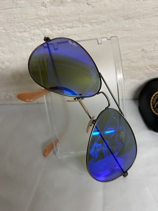 Gafas Ray-Ban; montura de metal en plateado (lente de cristal color azul). No es polarizada. Inconvenientes: la funda está deteriorada. PRECIO NEGOCIABLE, NO ACEPTAMOS INTERCAMBIOS.