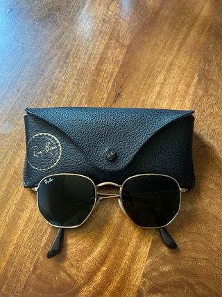 Gafas de sol Ray-Ban con montura dorada y lentes negras. Modelo RB 3548 - Diseño hexagonal. - Incluye funda protectora.